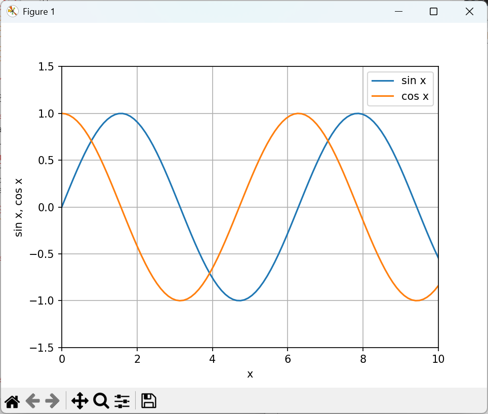 6. とりあえず感触を試すために,基本的な関数である sin x と cos x のグラフを作ってみましょう.numpy がすでにインストールされているので,以下のスクリプトを実行してみてください.