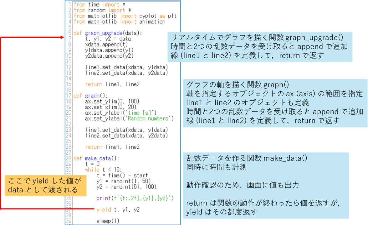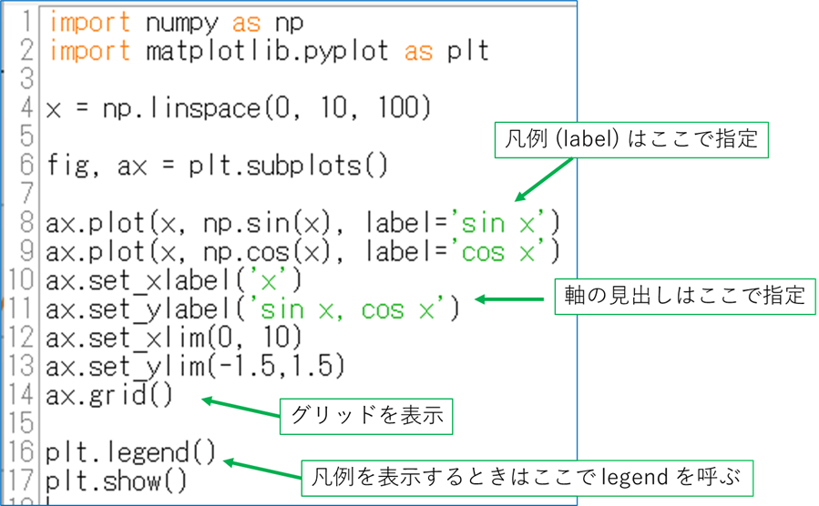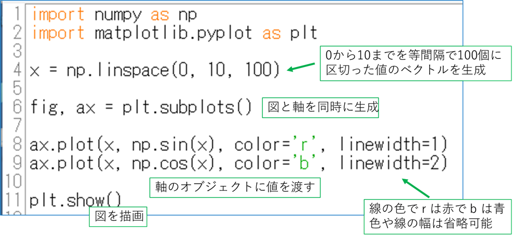 まず import 文ですが,numpy は略称として np を使用し,matplotlib は plt を使うということがお約束ですので,そこは勝手な名前にはしないでください.その他の説明は下図のようになります.