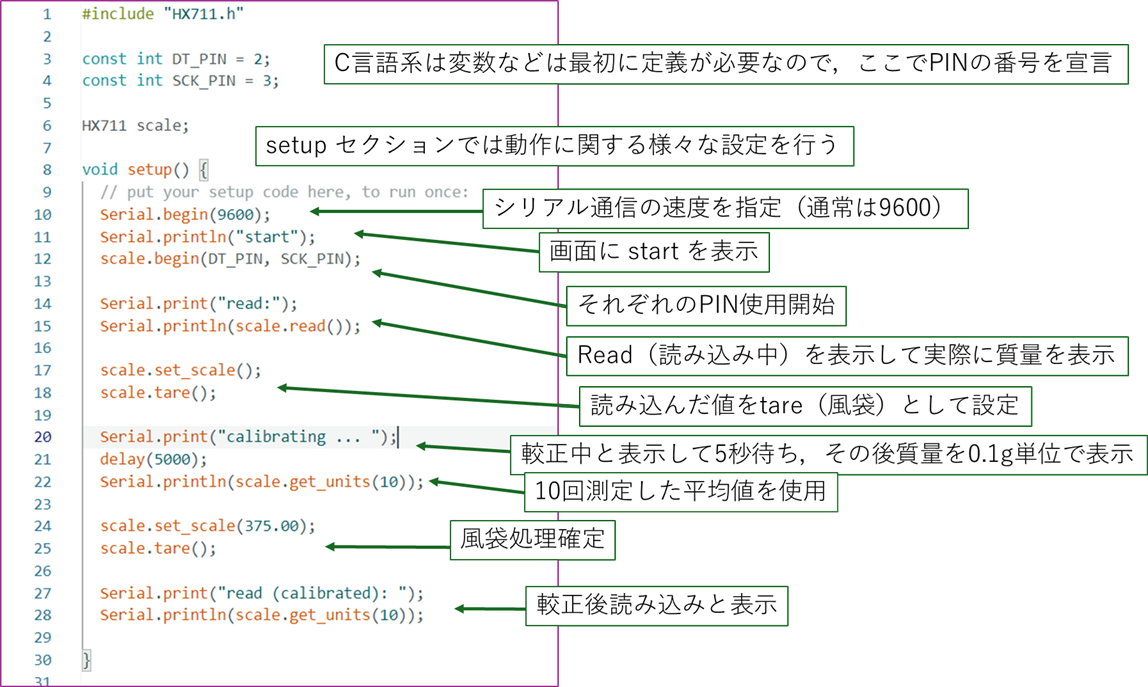 4. HX711は Arduino IDE でライブラリを読み込むことで必要な機能を使用できます.今回は以下のプログラムでまずは質量計測ができるようにしてみましょう.