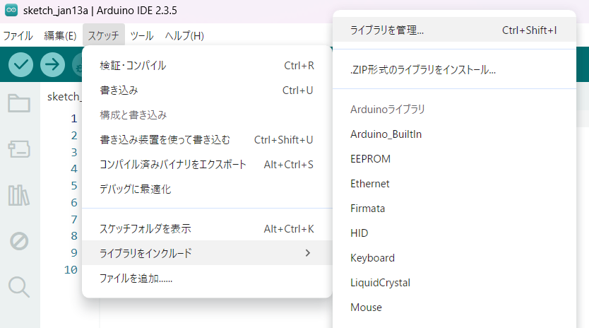 6. ロードセルはデジタル入出力ポートを使用しますが,それに付属している HX711 というA/D変換器を制御する必要がありますので,そのためのモジュールを Arduino IDE に組み込む必要があります.「スケッチ」メニューから「ライブラリをインクルード」を選択し,「ライブラリの管理」に進みます.