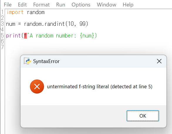 図2 5行目の print の中で文字列を ' で閉じるのを忘れている場合