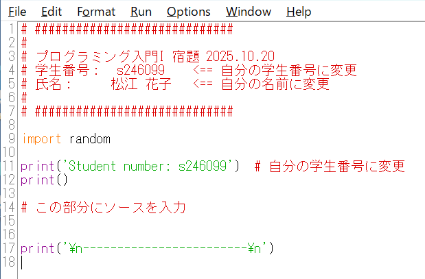 開いてみるとわかるように,まずは上部の学生番号と氏名を自分のものに変更してください.その上で,プログラム本体の中にも学生番号を出力する print 関数がありますので,その部分の学生番号も自分のものに変更してください.
