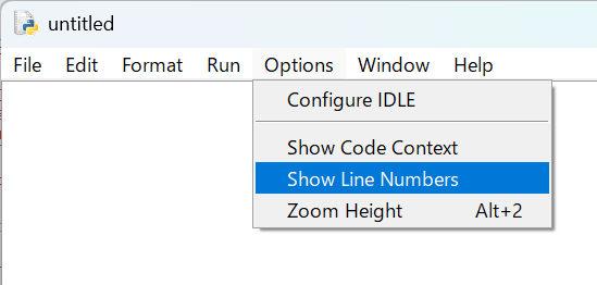 プログラムを作成して実行してみるとエラーとなる場合がよくあります.その際にエラーメッセージを IDLE のシェルに表示してくれるのですが,その時にはエラーが生じた原因が何行目にあるのかも教えてくれます.そのため,エディタで行番号を表示させることは必須と言っても過言ではありません.皆さんも行番号を表示させる設定を行っておいてください.